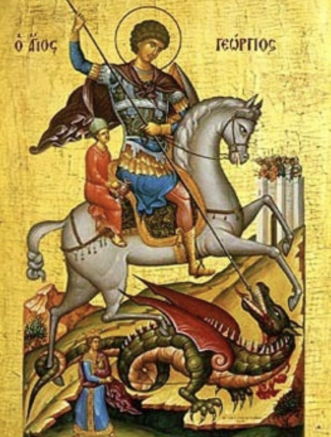 Για να εξευμενίσουν τον δράκο, οι χωρικοί του έστελναν κάθε μέρα ως τροφή από ένα παιδί, το οποίο επέλεγαν δια κλήρου. Ο Θεός τους λυπήθηκε κι έστειλε τον Άγιο Γεώργιο για να εξολοθρεύσει τον δράκο, σε μία ημέρα που ήταν έτοιμος να καταβροχθίσει την όμορφη μοναχοκόρη του τοπικού άρχοντα. Ο Άγιος, μετά από φοβερή μονομαχία με τον δράκο, τον σκότωσε κι έσωσε την ωραία κόρη. Τότε, ο πατέρας της, αλλά και όλο το χωριό που ήταν ειδωλολάτρες, βαπτίστηκαν Χριστιανοί.