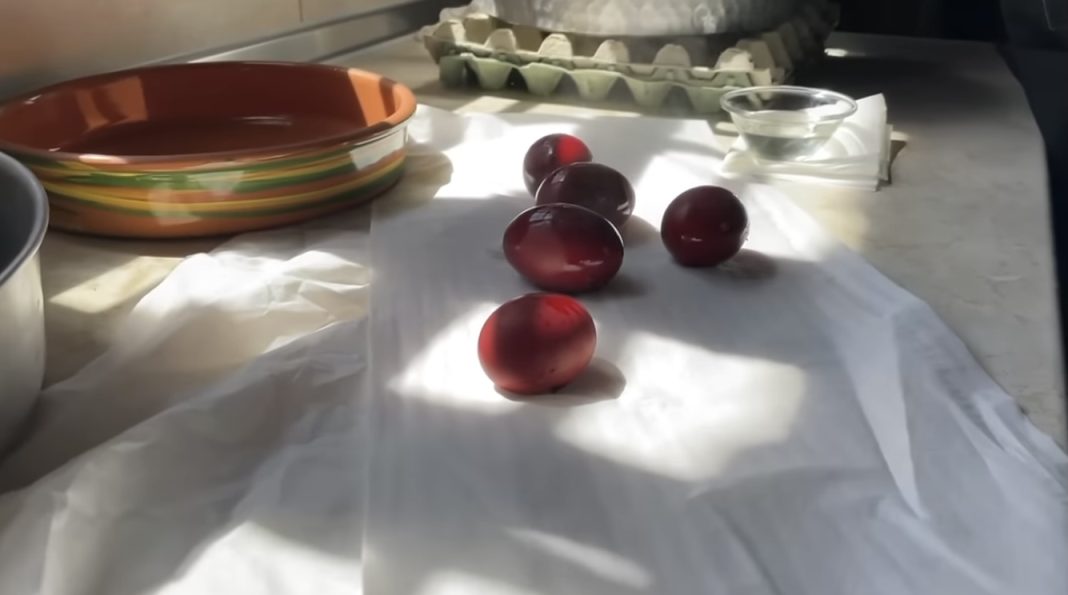 Στο βίντεο που ακολουθεί ο Γέροντας Νικήτας, στο Ιερό Κελί της Παναγίας Πορταΐτισσας δείχνει την παραδοσιακή τεχνική και σχολιάζει: «Τη Μεγάλη Πέμπτη, μετά τη θεία λειτουργία ερχόμαστε στο κελί και ετοιμάζουμε τα αυγά. Είναι μια παράδοση αιώνων. Αυτό το βότανο, το ριζάρι, στο Βυζάντιο το καλλιεργούσαν στη Θεσσαλία και το στέλναν στην Κωνσταντινούπολη για να βάψουν με πορφυρό χρώμα τα υφαντά και τα άμφια του Αυτοκράτορα».