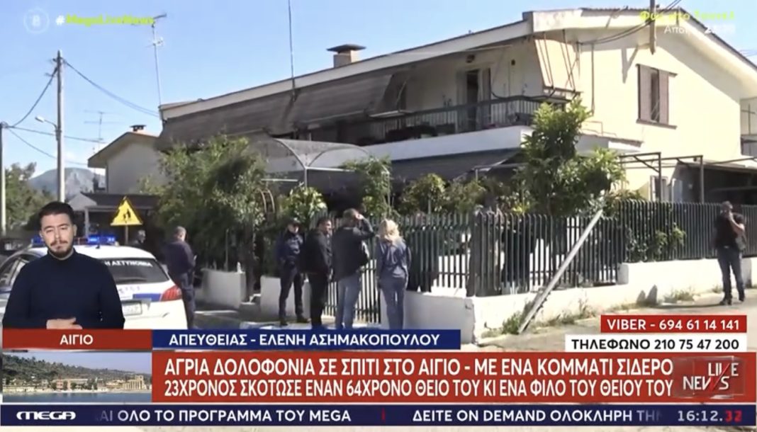 Σοκαρισμένη είναι η τοπική κοινωνία του Αιγίου μετά το άγριο διπλό φονικό που σημειώθηκε το πρωί της Παρασκευής στον Άγιο Αθανάσιο. Δράστης του στυγερού εγκλήματος είναι ο 23χρονος Β.Λ. ο οποίος σκότωσε τον θείο του και έναν φίλο του, με τους μάρτυρες να κάνουν λόγο για άνθρωπο που ήταν ιδιαίτερα βίαιος και φέρεται να αντιμετώπιζε σοβαρά ψυχολογικά προβλήματα.