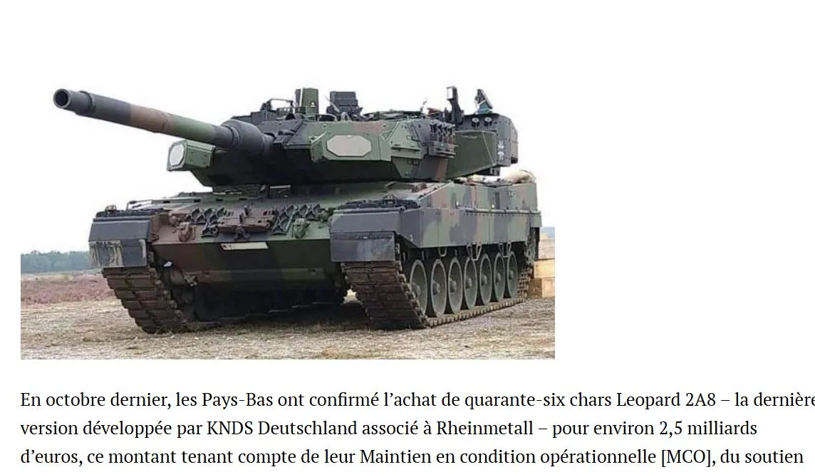 Τον περασμένο Οκτώβριο, η Ολλανδία επιβεβαίωσε την αγορά σαράντα έξι αρμάτων μάχης Leopard 2A8 – την τελευταία έκδοση που αναπτύχθηκε από την KNDS Deutschland σε συνεργασία με τη Rheinmetall – για περίπου 2,5 δισεκατομμύρια ευρώ, το ποσό αυτό λαμβάνοντας υπόψη την επιχειρησιακή τους ετοιμότητα, την υλικοτεχνική υποστήριξη, την εκπαίδευση και την προμήθεια «ειδικού» εξοπλισμού.