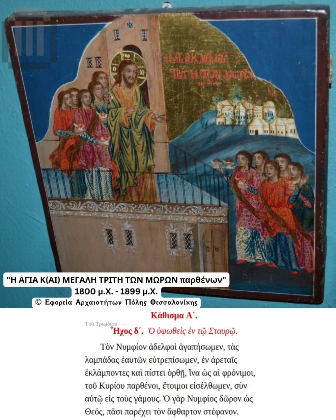 «Τῇ ἁγίᾳ καὶ μεγάλῃ Τρίτῃ, τῆς τῶν δέκα Παρθένων παραβολῆς, τῆς ἐκ τοῦ ἱεροῦ Εὐαγγελίου, μνείαν ποιούμεθα». Δέκα παρθένες περιμένουν τον Νυμφίο να έρθει να παραλάβει τη νύφη. «Πέντε εξ αυτών ήσαν φρόνιμοι» και είχαν προνοήσει να πάρουν αρκετό λάδι, ώστε να έχουν για να φωτίζουν τα λυχνάρια τους, κατά τη διάρκεια της αναμονής τους. «Πέντε ήσαν μωραί», οι οποίες, λόγω της καθυστέρησης της άφιξης του Νυμφίου, αποκοιμήθηκαν. Έτσι όταν ακούγεται η φωνή «Ιδού ο Νυμφίος έρχεται», ψάχνουν να βρουν λάδι, για να ανάψουν τα σβησμένα λυχνάρια τους, με αποτέλεσμα να μην γίνουν δεκτές στο γαμήλιο δείπνο, δηλαδή να μείνουν «εκτός νυμφώνος».