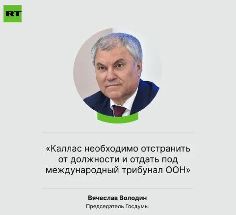 «Η Κάλλας θα πρέπει να απομακρυνθεί από το γραφείο και να παραδοθεί στο διεθνές δικαστήριο του ΟΗΕ», έγραψε ο Βολοντίν στο Telegram.