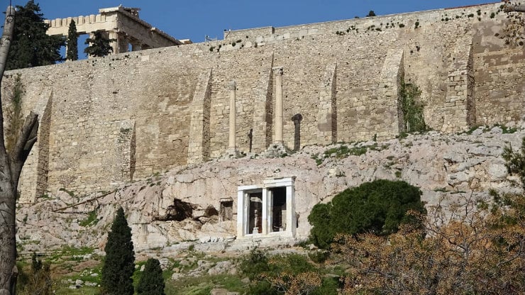 Εδώ και πολλές δεκαετίες οι περαστικοί από τη γειτονιά της Ακρόπολης αναρωτιόντουσαν τι είναι αυτή η σπηλιά στη νότια πλαγιά του Ιερού Βράχου. Το εργοτάξιο των τελευταίων χρόνων δήλωνε ότι εκεί εκτελείται ένα ακόμη αναστηλωτικό πρόγραμμα. Ο χώρος αποκαταστάθηκε και οι περιπατητές της Διονυσίου Αρεοπαγίτου θέλουν να μάθουν περισσότερα για αυτό το μνημείο που τραβάει το βλέμμα τους όπως κοιτούν πάνω από το Θέατρο του Διονύσου.