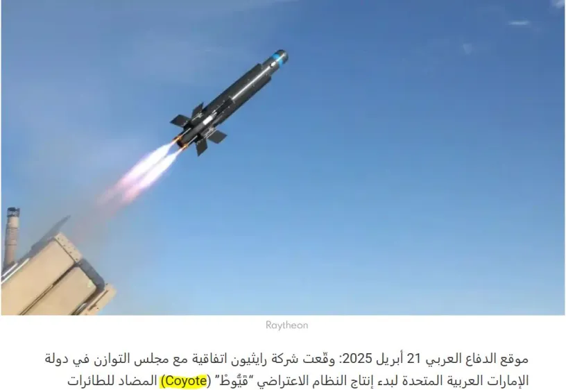 Η αμυντική βιομηχανική εταιρεία των ΗΠΑ, Raytheon, υπέγραψε συμφωνία με το Συμβούλιο Tawazun στα Ηνωμένα Αραβικά Εμιράτα για την έναρξη της παραγωγής του συστήματος αναχαίτισης αντι-drone Coyote εντός της χώρας.