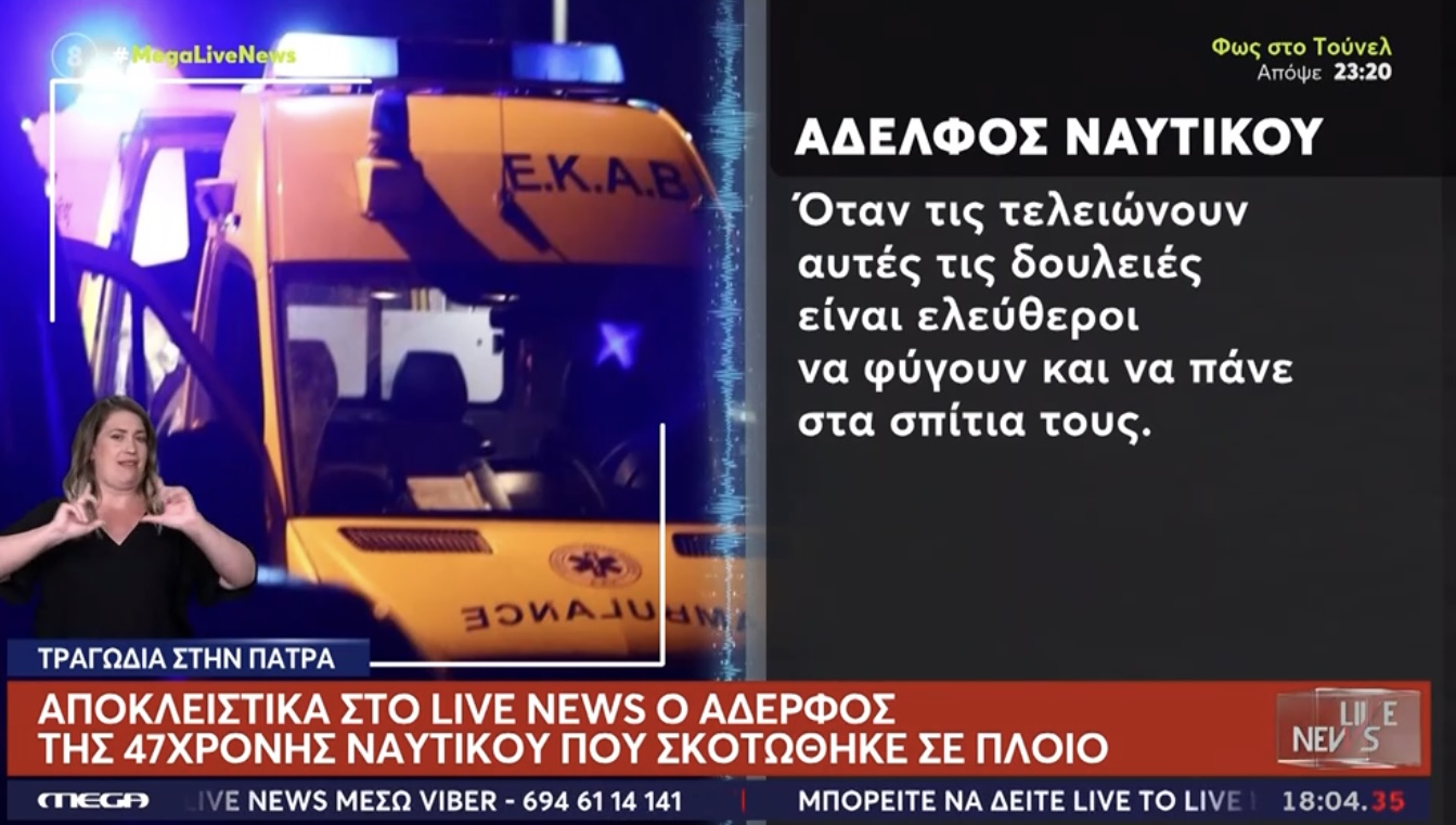 Συντετριμμένη είναι η οικογένεια της 47χρονης ναυτικού που σκοτώθηκε σε δυστύχημα στο λιμάνι της Πάτρας. Ο αδερφός της περιέγραψε τα όσα έμαθε για την τραγωδία, αλλά και τα όσα ακολούθησαν αργότερα.