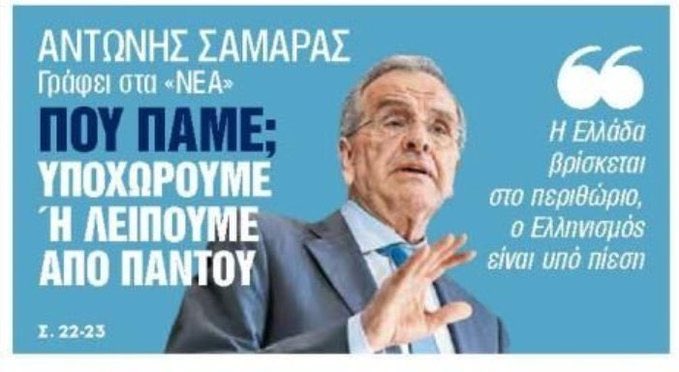 Σε μια πρωτοφανούς έντασης επίθεση, ο πρώην πρωθυπουργός Αντώνης Σαμαράς κατηγορεί ευθέως τον Κυριάκο Μητσοτάκη για εγκατάλειψη των εθνικών συμφερόντων και άσκηση πολιτικής “άκρατου κατευνασμού” έναντι της Τουρκίας, μέσω άρθρου του που δημοσιεύτηκε το Σάββατο (17/5) στην εφημερίδα “Τα Νέα” με τίτλο “Πού πάμε;”.