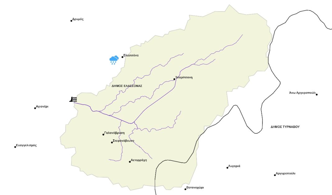 Εικόνα 1. Η απεικόνιση, της «λεκάνης απορροής» (του «“ΕλασσονίτηΠοταμού” που αντιστοιχεί έως την θέση στην οποία πρόκειται να κατασκευαστεί το «Φράγμα “Αγιονερίου” Ποταμού Ελασσονίτη», του «Δήμου Ελασσόνας»), του αντίστοιχου «υδρογραφικού (γραμμικού) δικτύου» (γραμμές με «έντονη μπλε» απόχρωση), του μετεωρολογικού σταθμού της «Ελασσόνας, Δήμου Ελασσόνας» («meteo.gr»), (θεματικό εικονίδιο «σύννεφο με βροχή» με «γαλάζια απόχρωση»), των περιγραμμάτων του «Δήμου Ελασσόνας» και του «Δήμου Τυρνάβου» (διακεκομμένες γραμμές με «μαύρη» απόχρωση)  και των οικισμών του «Δήμου Ελασσόνας» και του «Δήμου Τυρνάβου» (κουκκίδες με «μαύρη» απόχρωση), όπως απεικονίζονται στο «ελεύθερο διαδικτυακά λογισμικό» «Q.G.I.S.» [4], μέσω των σχετικών αρχείων που ανακτήθηκαν τόσο από την σχετική διαδικτυακή «πλατφόρμα» («Copernicus») όσο και από την σχετική διαδικτυακή «πλατφόρμα» («ΕΛ.ΣΤΑΤ.»), [1,2,4].
