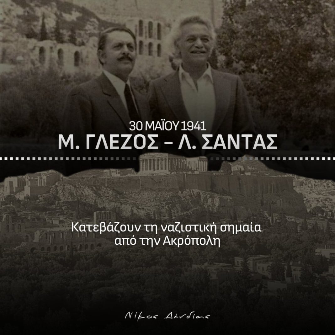 Σαν σήμερα, στις 30 Μάϊου 1941 δύο νέα παιδιά, οι Μανώλης Γλέζος και Λάκης Σάντας μη μπορώντας να αντικρύζουν το σύμβολο του ναζισμού να κυματίζει στον ιερό βράχο της Ακροπόλεως αποφάσισαν να κάνουν μια επιχείρηση στην ουσία αυτοκτονίας, να το γκρεμίσουν στα βράχια και να υψώσουν την γαλανόλευκη.