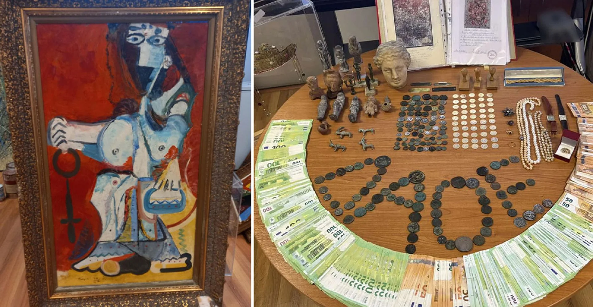 Στα κατασχεθέντα της υπόθεσης από οικίες και χώρους στην Αττική που ερεύνησε η Αστυνομία, βρίσκονται 19 θρησκευτικές εικόνες και 2.087 νομίσματα που εμπίπτουν στο νόμο περί αρχαιοτήτων, αλλά και περισσότεροι από 200 πλαστοί πίνακες Ελλήνων και ξένων ζωγράφων.