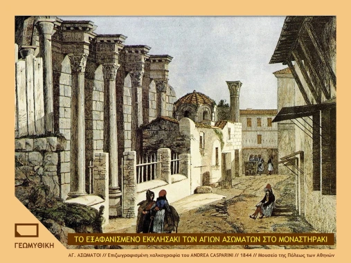 Άγιος Ασώματος στα Σκαλιά. Γνωριμία με το κατεδαφισμένο εκκλησάκι στο τείχος της Βιβλιοθήκης του Αδριανού στο Μοναστηράκι μέσα από παλιά σχέδια και γκραβούρες.