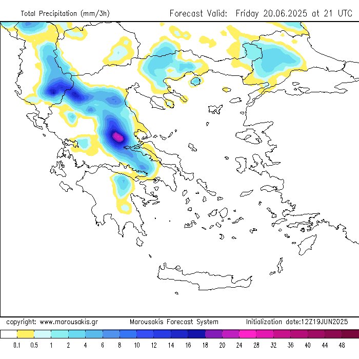 Ακολουθούν ενδεικτικοί χάρτες από το προγνωστικό μας σύστημα που αναφέρονται στην ένταση της βροχής αλλά και την πιθανότητα χαλαζοπτώσεων».