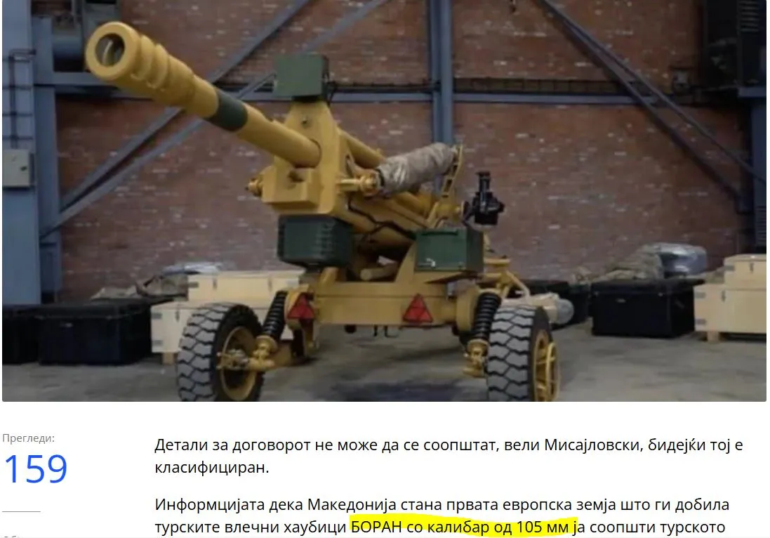 Τουρκικά ρυμουλκούμενα οβιδοβόλα BORAN διαμετρήματος 105 mm παραδόθηκαν στις Ένοπλες Δυνάμεις των Σκοπίων την περασμένη εβδομάδα και η επίσημη προώθησή τους θα πραγματοποιηθεί τον επόμενο μήνα, επιβεβαίωσε, ο υπουργός Άμυνας Βλάντο Μισαϊλόφσκι στο MIA.