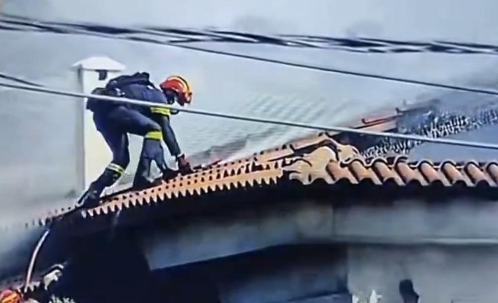 Πυροσβέστης με κίνδυνο της ζωής του σκαρφαλώνει σε κεραμιδένια στέγη, για να τα βάλει με τις φλόγες στη μεγάλη φωτιά της Παλαιάς Φώκαιας, σκηνικό που απαθανατίστηκε σε βίντεο smartphone, το οποίο και έγινε viral.