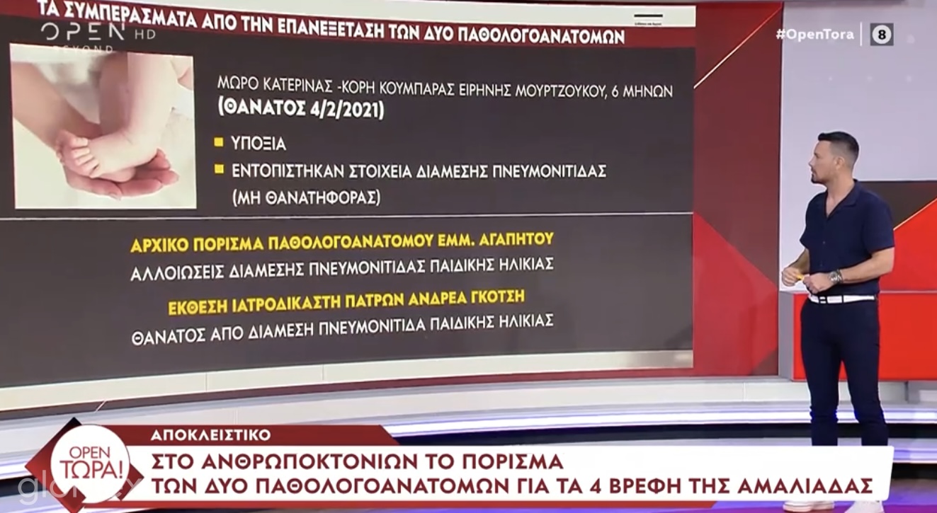 Το πόρισμα των δυο παθολογοανατόμων που εξέτασαν εκ νέου τις σορούς των 4 βρεφών έδειξε ως κοινό εύρημα την υποξία, δηλαδή την στέρηση οξυγόνου ενώ κανένα από τα άτυχα παιδιά δεν είχε κάποιο παθολογικό εύρημα που θα δικαιολογούσε τον θάνατό του.