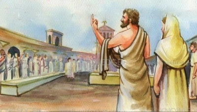 Ο κόσμος απο το πρωί άρχιζε να κατακλύζει το δικαστήριο. Μέσα στο πολύβουο πλήθος εμφανίζεται και η Ασπασία με τον σύντροφό της.Το κλίμα τόσο στους δικαστές οσο και στο ευμετάβλητο πλήθος ηταν εναντίον της Ασπασίας. Όλοι ομως με κομμένη την ανάσα αδημονούσαν να ακούσουν την ομιλία του Περικλή, συνηγόρου της Ασπασίας.