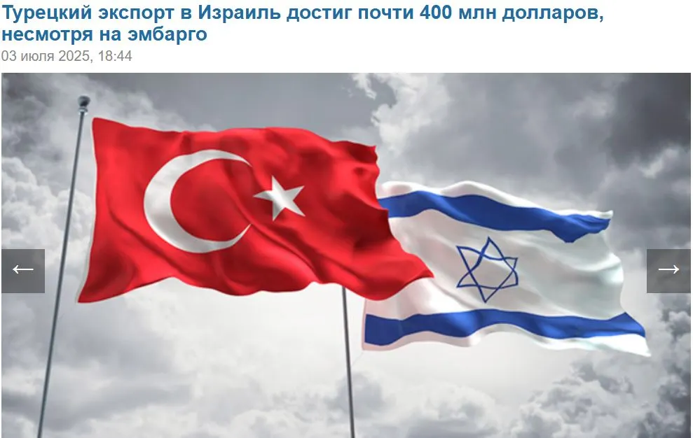 Σύμφωνα με την UN Comtrade, η Τουρκία ήταν η πέμπτη μεγαλύτερη πηγή εισαγωγών του Ισραήλ το 2024, με τις συνολικές εξαγωγές να φτάνουν τα 2,86 δισεκατομμύρια δολάρια. Αυτό τοποθετεί την Τουρκία πίσω μόνο από την Κίνα, τις Ηνωμένες Πολιτείες, τη Γερμανία και την Ιταλία, παρά την εμπορική απαγόρευση.