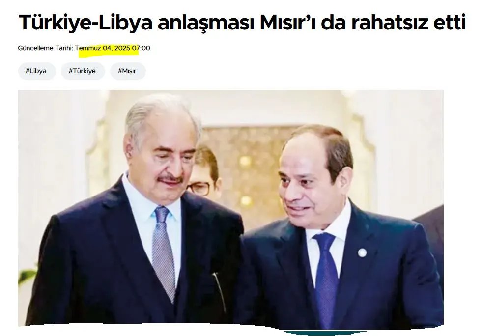 Υποστηρίζεται ότι η ελληνική κυβέρνηση, η οποία έχει λάβει μέτρα κατά των εξελίξεων στη γραμμή Λιβύης-Τουρκίας, θέλει να συμπεριληφθεί η Αίγυπτος στη διαδικασία, ενώ ο Έλληνας υπουργός Εξωτερικών, Γιώργος Γεραπετρίτης, φέρεται να μεταβαίνει στη Λιβύη, καταλήγει το τουρκικό δημοσίευμα.