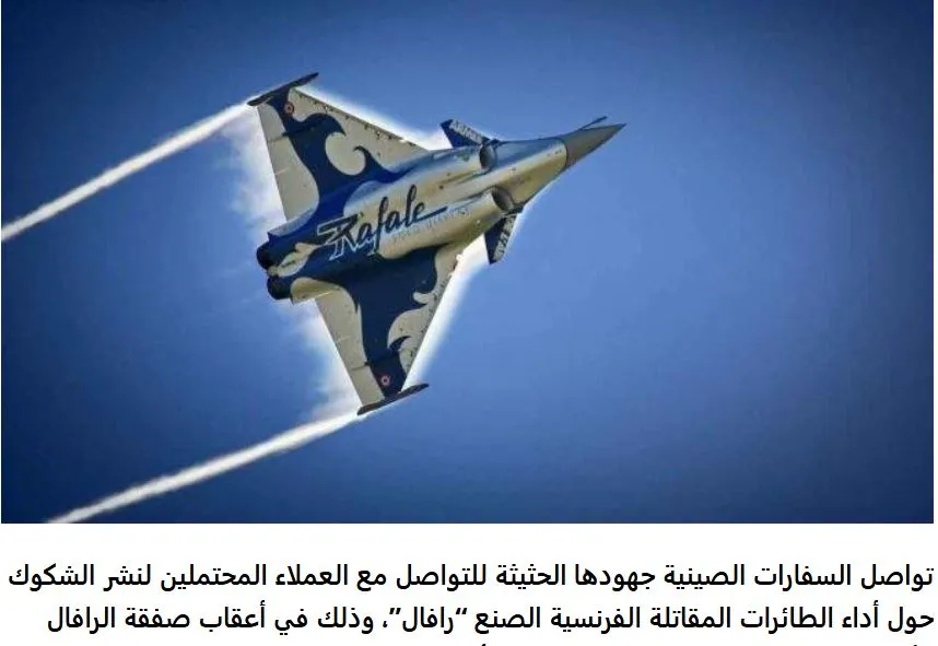 Οι κινεζικές πρεσβείες συνεχίζουν τις εντατικές τους προσπάθειες να επικοινωνήσουν με πιθανούς πελάτες για να εκφράσουν αμφιβολίες σχετικά με την απόδοση των γαλλικής κατασκευής μαχητικών αεροσκαφών Rafale.