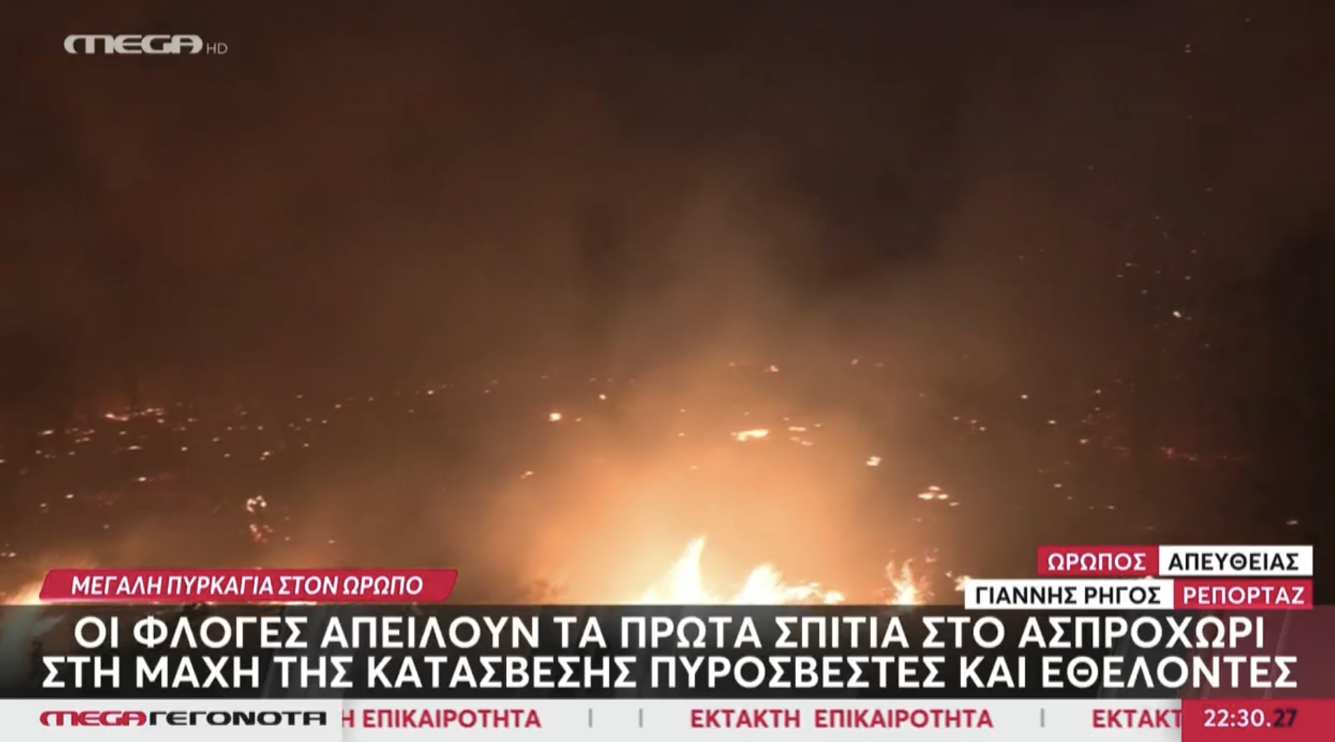 Μια ακόμη ολονύχτια μάχη με τις φλόγες ετοιμάζονται να δώσουν οι πυροσβεστικές δυνάμεις, καθώς η μεγάλη δασική πυρκαγιά στον Δήμο Ωρωπού μαίνεται ανεξέλεγκτη, έχοντας περικυκλώσει τον οικισμό Ασπροχώρι.