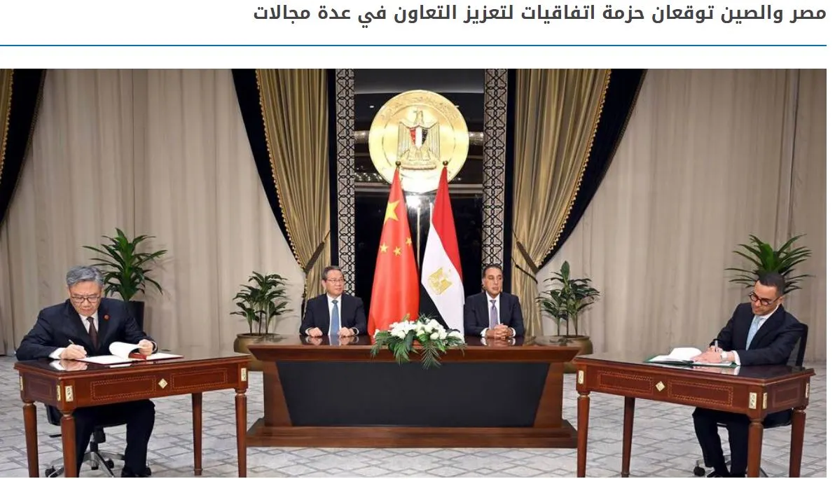 Ο Αιγύπτιος πρωθυπουργός Μουσταφά Μαντμπούλι και ο Κινέζος πρωθυπουργός Λι Κετσιάνγκ υπέγραψαν μια σειρά από έγγραφα και συμφωνίες που αποσκοπούν στην επέκταση της συνεργασίας μεταξύ Αιγύπτου και Κίνας σε διάφορους ζωτικούς τομείς, στο πλαίσιο των αναπτυσσόμενων σχέσεων μεταξύ των δύο χωρών .