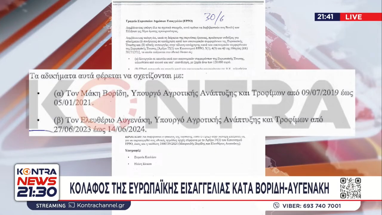 Σοβαρές εξελίξεις πυροδοτεί η έρευνα της Ευρωπαϊκής Εισαγγελίας (EPPO) για το σκάνδαλο του ΟΠΕΚΕΠΕ, με δύο πρώην υπουργούς Αγροτικής Ανάπτυξης, τον Μάκη Βορίδη και τον Λευτέρη Αυγενάκη, να βρίσκονται στο επίκεντρο. Σύμφωνα με το διαβιβαστικό έγγραφο που εστάλη στη Βουλή, οι δύο πολιτικοί φέρονται να εμπλέκονται σε αδικήματα που σχετίζονται με την υποβοήθηση και υποκίνηση υπεξαίρεσης ευρωπαϊκών γεωργικών κονδυλίων κατά την άσκηση των καθηκόντων τους.