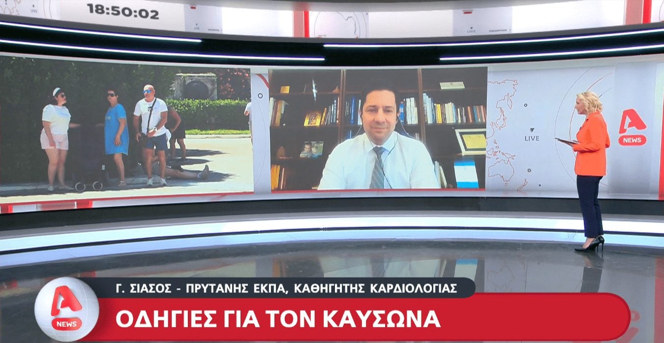 O Πρύτανης του Πανεπιστημίου Αθηνών καθηγητής Γεράσιμος Σιάσος ήταν προσκεκλημμένος στο κεντρικό δελτίο του τηλεοπτικού σταθμού Alpha με τη δημοσιογράφο Μαρία Νικόλτσιου όπου αναφέρθηκε στην θερμική καταπόνηση και τα μέτρα πρόληψης ιδιώς για τις ευπαθείς ομάδες του πληθυσμού.