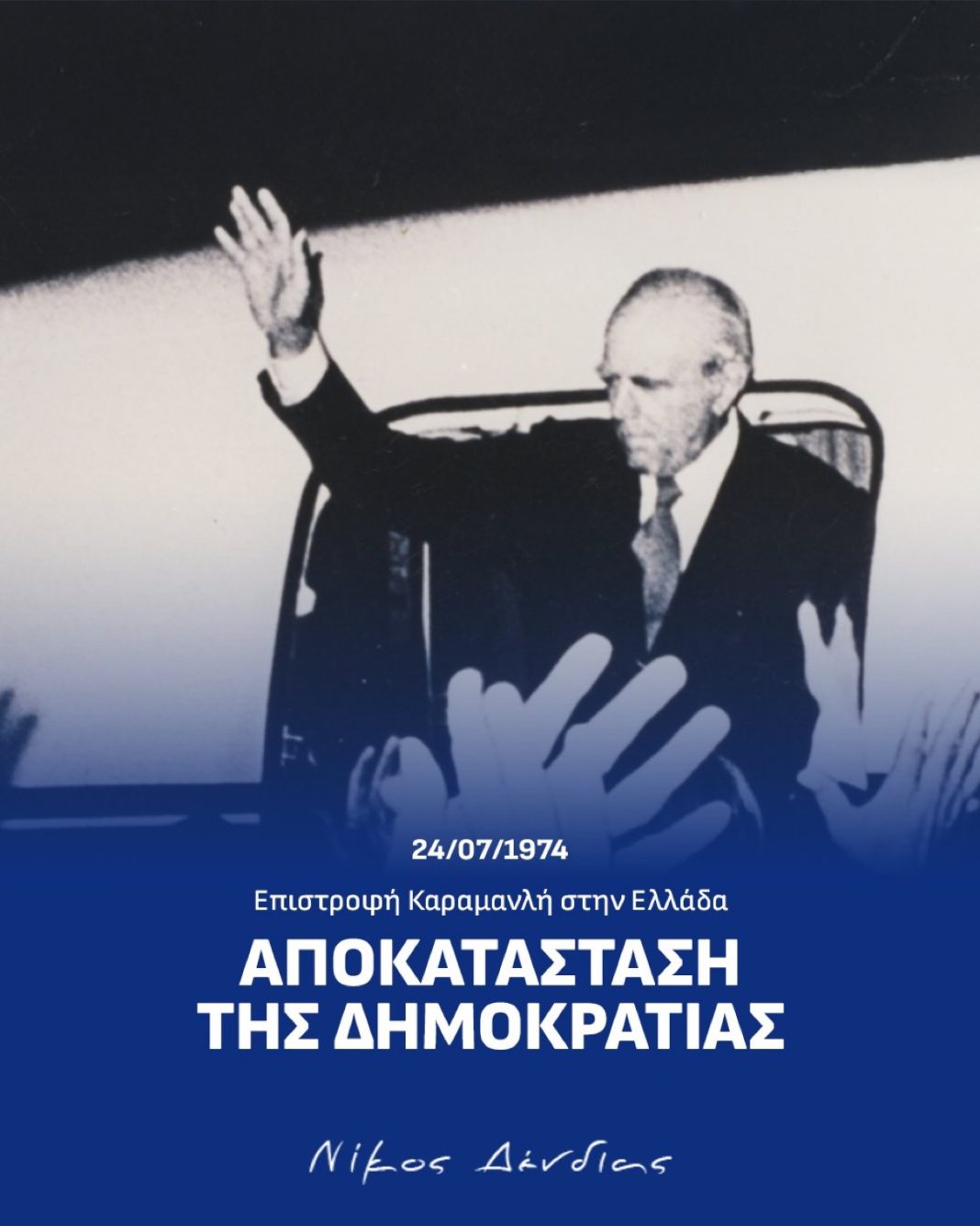 51 χρόνια μετά την επιστροφή του Κωνσταντίνου Καραμανλή στην Ελλάδα, η σημερινή επέτειος μας υπενθυμίζει ότι η Δημοκρατία δεν αποτελεί ανεπίστροφη κατάκτηση. Η ευθύνη μας για τη διαφύλαξή της είναι διαρκής.
