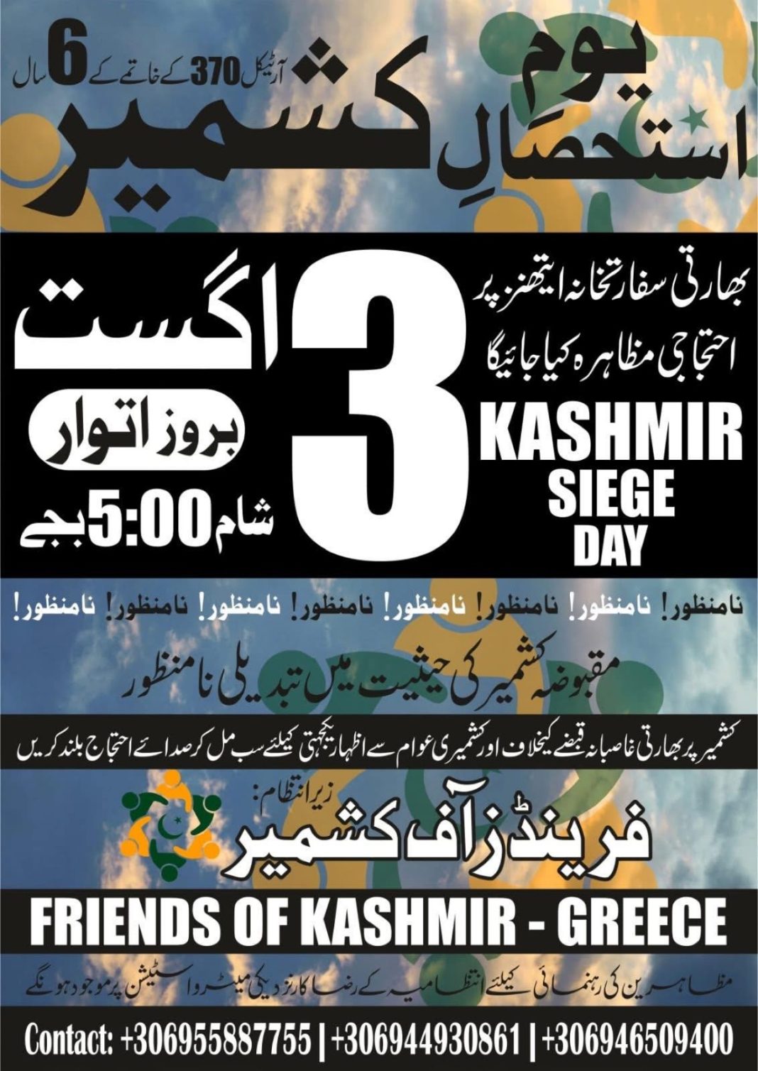 Νέα συγκέντρωση διαμαρτυρίας έξω απο την πρεσβεία της Ινδίας την Κυριακή 3 Αυγούστου ανακοίνωσαν οι “Φίλοι του Κασμίρ”, που ελέγχονται απο την πακιστανική πρεσβεία