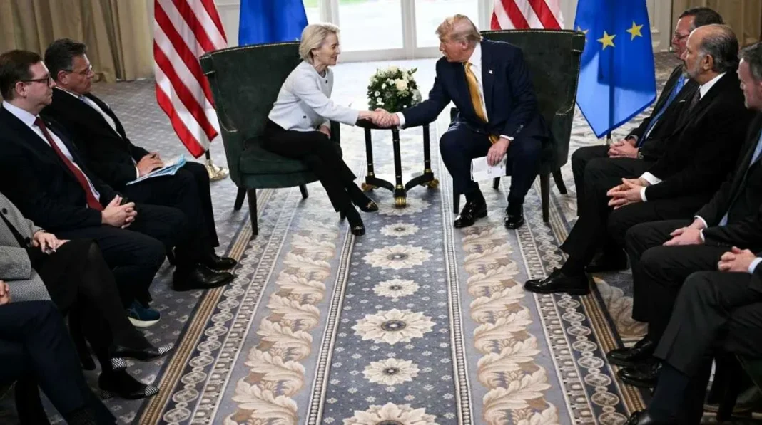 Αυτή η ενεργειακή συμφωνία αποτελεί μέρος μιας ευρύτερης εμπορικής συμφωνίας μεταξύ των δύο διατλαντικών εταίρων για την αποφυγή της πιθανότητας ενός πλήρους εμπορικού πολέμου.