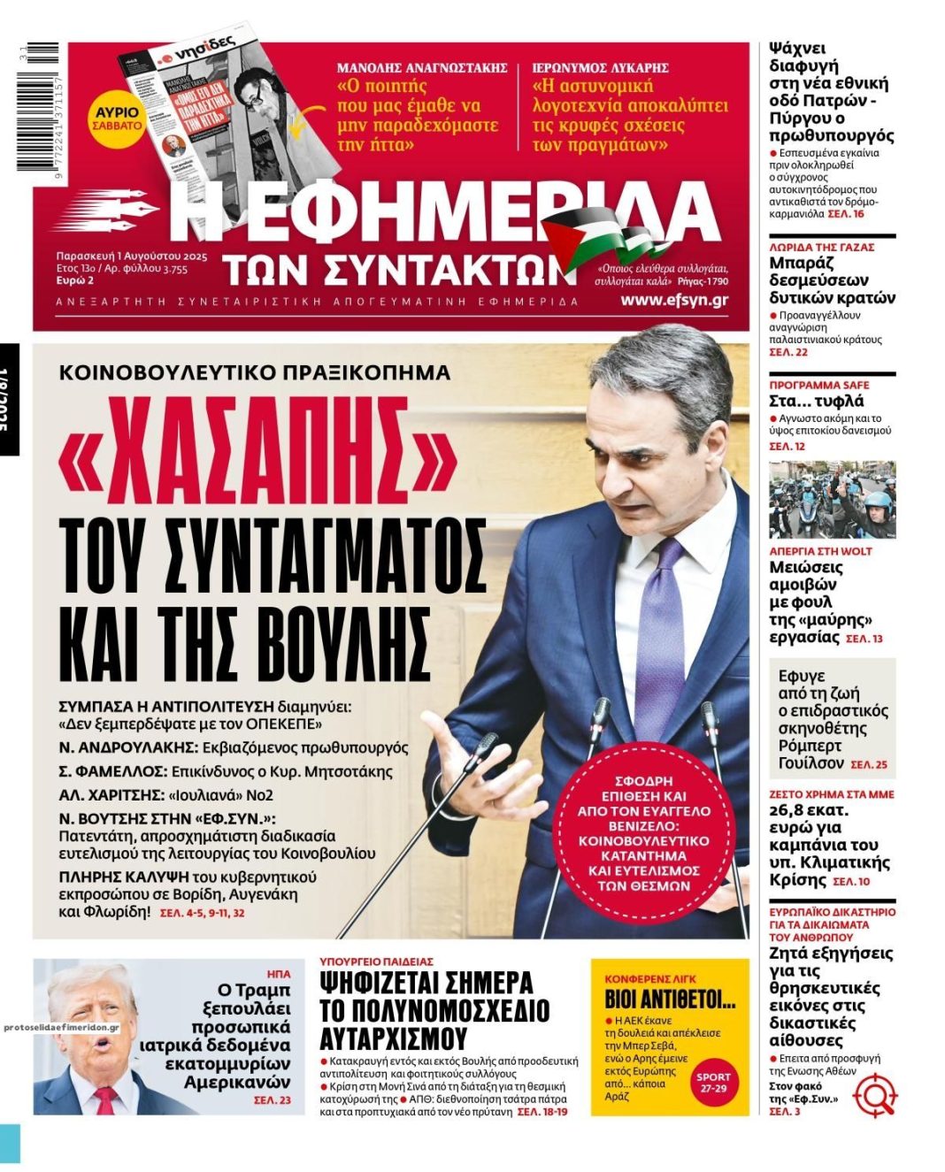 MEDIAΤο πρωτοσέλιδα των εφημερίδων σήμερα Παρασκευη1/08/2025 - 7:00πμΔΙΑΒΑΣΤΕ ΕΠΙΣΗΣ Τo Σάββατο 29/11 με την Εστία: Κλασσικά παραμύθιαΤο Σάββατο 29/11 με την «δημοκρατία»: Ο πόλεμος του πετρελαίουΤα πρωτοσέλιδα των εφημερίδων σήμερα ΠαρασκευηΤο Σάββατο 29/11 με την Εspresso: Κλασσικά μυθιστορήματαTην Παρασκευή 28/11 με την «δημοκρατία»: Η Ιστορία της ΔραχμήςΤα πρωτοσέλιδα των εφημερίδων σήμερα ΠέμπτηΤα πρωτοσέλιδα των εφημερίδων σήμερα ΤετάρτηΤα πρωτοσέλιδα των εφημερίδων σήμερα Τρίτη Δείτε εδώ τα πρωτοσέλιδα των εφημερίδων σήμερα Παρασκευή 1 Αυγούστου 2025. Συνεχίστε την ανάγνωση.ΠΡΩΤΟΣΕΛΙΔΑ ΑΦΗΣΤΕ ΜΙΑ ΑΠΑΝΤΗΣΗ Ακύρωση απάντησης Σχόλιο:εισάγετε το σχόλιό σας! Όνομα:*παρακαλώ εισάγετε το όνομά σας εδώ Email:*έχετε εισάγει εσφαλμένη διεύθυνση ηλεκτρονικού ταχυδρομείου!παρακαλώ εισάγετε εδώ την ηλεκτρονική σας διεύθυνση αποθηκεύστε το όνομα, το ηλεκτρονικό ταχυδρομείο και τον ιστότοπό μου σε αυτό το πρόγραμμα περιήγησης για την επόμενη φορά που θα σχολιάσω. ΔΗΜΟΦΙΛΗ Το τελευταίο αντίο στον 19χρονο Ραφαηλ: Το φέρετρο έφτασε στην εκκλησία τυλιγμένο στη γαλανόλευκη στους ώμους στρατιωτικών που δεν μπορούσαν να συγκρατήσουν τα δάκρυά...Συγκλονίζει ο πατέρας του 19χρονου στρατιώτη Ραφαήλ που έχασε τη ζωή του στη ΡόδοΑύριο η κηδεία του 19χρονου Ραφαηλ: “Ένα κοπέλι έσβησε πο μια χειροβομβίδα” γράφει συντετριμμένος ο πατέρας τουΣάλος με την ανάρτηση του Πάνου Καμμενου για τους “τυχερούς” του ΟΠΕΚΕΠΕ που κερδίζουν συνεχως λαχείαΕπιβίωσε από την τρομοκρατική επίθεση της 11ης Σεπτεμβρίου, για να τον σκοτώσουν στο ξύλο τρία καθάρματα…Η σπαρακτική μαντινάδα του πατέρα του 19χρονου Ραφαηλ που σκοτώθηκε στη ΡόδοΙστορική η «κατρακύλα» Μητσοτακη χωρίς σημεία ανάκαμψηςΧαμός στη Βουλη με τον Κυριάκο Βελόπουλο: Είστε μαφιόζοι και εγκληματική οργάνωση!