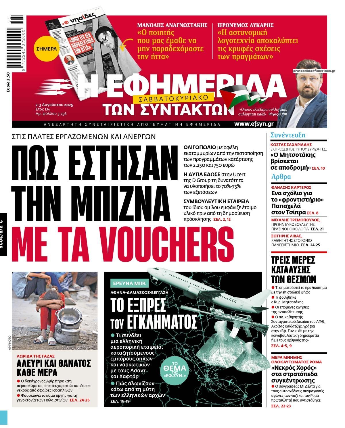 Δείτε εδώ τα πρωτοσέλιδα των εφημερίδων σήμερα Σάββατο 2 Αυγούστου 2025. Συνεχίστε την ανάγνωση.