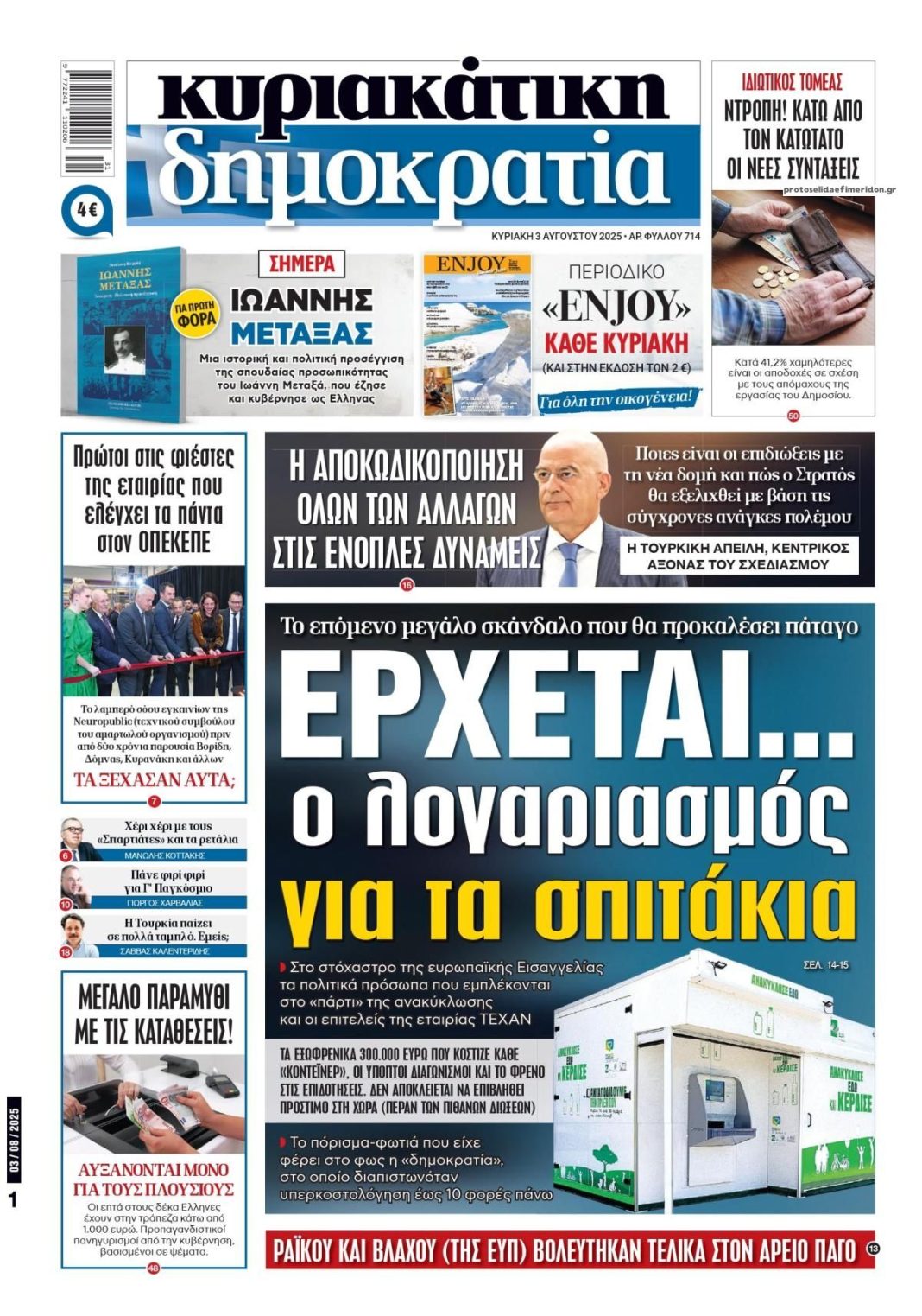 MEDIAΤα πρωτοσέλιδα των Κυριακάτικων εφημερίδων3/08/2025 - 7:00πμΔΙΑΒΑΣΤΕ ΕΠΙΣΗΣ Τo Σάββατο 29/11 με την Εστία: Κλασσικά παραμύθιαΤο Σάββατο 29/11 με την «δημοκρατία»: Ο πόλεμος του πετρελαίουΤα πρωτοσέλιδα των εφημερίδων σήμερα ΠαρασκευηΤο Σάββατο 29/11 με την Εspresso: Κλασσικά μυθιστορήματαTην Παρασκευή 28/11 με την «δημοκρατία»: Η Ιστορία της ΔραχμήςΤα πρωτοσέλιδα των εφημερίδων σήμερα ΠέμπτηΤα πρωτοσέλιδα των εφημερίδων σήμερα ΤετάρτηΤα πρωτοσέλιδα των εφημερίδων σήμερα Τρίτη Δείτε εδώ τα πρωτοσέλιδα των εφημερίδων σήμερα Κυριακή 03 Αυγούστου 2025. Συνεχίστε την ανάγνωση.ΠΡΩΤΟΣΕΛΙΔΑ ΑΦΗΣΤΕ ΜΙΑ ΑΠΑΝΤΗΣΗ Ακύρωση απάντησης Σχόλιο:εισάγετε το σχόλιό σας! Όνομα:*παρακαλώ εισάγετε το όνομά σας εδώ Email:*έχετε εισάγει εσφαλμένη διεύθυνση ηλεκτρονικού ταχυδρομείου!παρακαλώ εισάγετε εδώ την ηλεκτρονική σας διεύθυνση αποθηκεύστε το όνομα, το ηλεκτρονικό ταχυδρομείο και τον ιστότοπό μου σε αυτό το πρόγραμμα περιήγησης για την επόμενη φορά που θα σχολιάσω. ΔΗΜΟΦΙΛΗ Το τελευταίο αντίο στον 19χρονο Ραφαηλ: Το φέρετρο έφτασε στην εκκλησία τυλιγμένο στη γαλανόλευκη στους ώμους στρατιωτικών που δεν μπορούσαν να συγκρατήσουν τα δάκρυά...Επιβίωσε από την τρομοκρατική επίθεση της 11ης Σεπτεμβρίου, για να τον σκοτώσουν στο ξύλο τρία καθάρματα…Εκτακτο διάγγελμα ΖελενσκιΙστορική η «κατρακύλα» Μητσοτακη χωρίς σημεία ανάκαμψηςΑύριο η κηδεία του 19χρονου Ραφαηλ: “Ένα κοπέλι έσβησε πο μια χειροβομβίδα” γράφει συντετριμμένος ο πατέρας τουΣυγκλονίζει ο πατέρας του 19χρονου στρατιώτη Ραφαήλ που έχασε τη ζωή του στη ΡόδοBροχή σκανδάλων και εισαγγελέας στο Ίδρυμα Νεολαίας και Δια Βίου ΜάθησηςΙσλαμοφασιστόμουτρα που εισήλθαν στη χώρα ως «Ασυνόδευτα ανήλικα» βίασαν βάναυσα γυναίκα στη Γαλλία