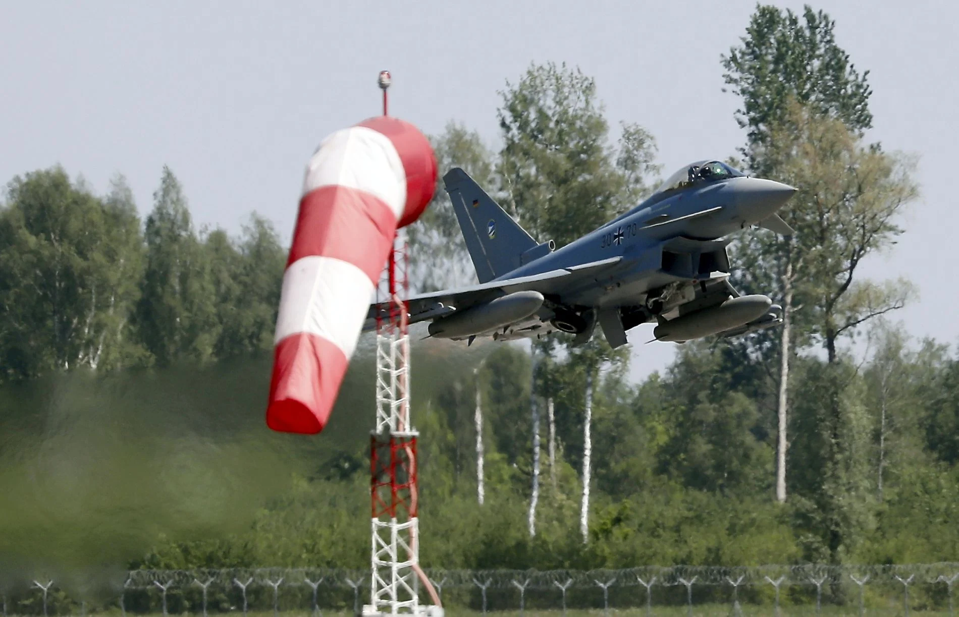 A German Air Force Eurofighter Typhoon takes off 21 May 2024. EPA/TOMS KALNINS