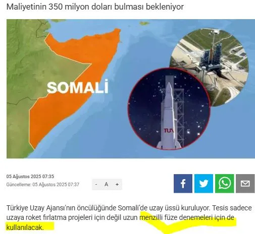 Μια διαστημική βάση ιδρύεται στη Σομαλία υπό την ηγεσία της Τουρκικής Διαστημικής Υπηρεσίας. Η εγκατάσταση θα χρησιμοποιηθεί όχι μόνο για έργα εκτόξευσης διαστημικών πυραύλων αλλά και για δοκιμές πυραύλων μεγάλου βεληνεκούς.
