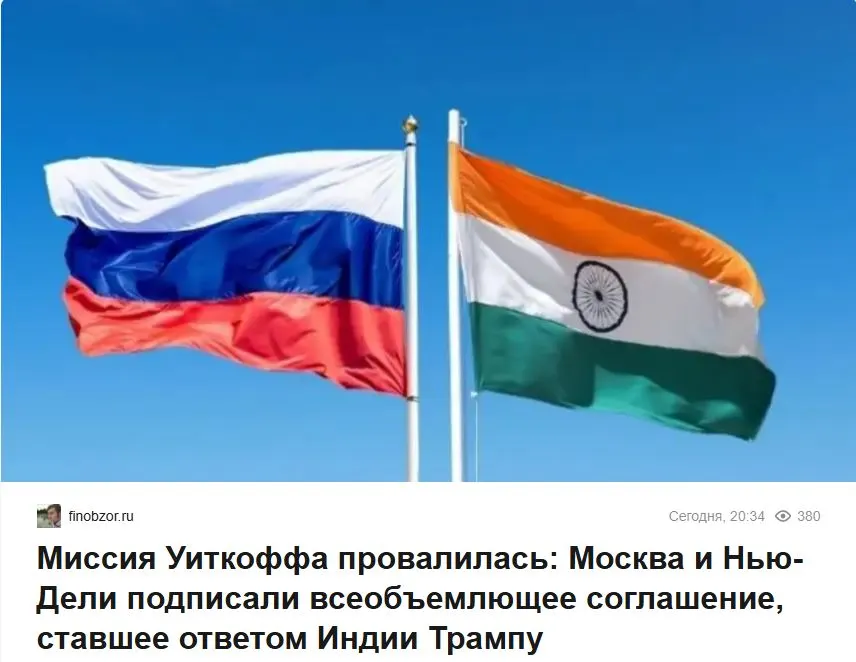 «Η αποστολή του Γουίτκοφ απέτυχε: Η Μόσχα και το Νέο Δελχί υπέγραψαν μια συνολική συμφωνία που έγινε η απάντηση της Ινδίας στον Τραμπ», γράφει το ρωσικό δημοσίευμα.