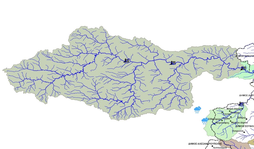 Εικόνα 1. Η απεικόνιση, της «λεκάνης απορροής» (χρωματισμένη με «πράσινη» απόχρωση) (των ρεμάτων που αντιστοιχούν έως την θέσηστην οποία κατασκευάστηκε, το συγκεκριμένο φράγμα), του«υδρογραφικού (γραμμικού) δικτύου» (γραμμές με «έντονη μπλε» απόχρωση), των θέσεων των διαφόρων φραγμάτων, [το «Φράγμα Ιβαίλοβγκραντ («Ivaylovgrad») Βουλγαρίας» απεικονίζεται στο άνω και δεξιά, βορειοανατολικό, μέρος της ανωτέρω εικόνας], (σύμβολο «φράγμα με νερό εκατέρωθεν των πλευρών του» με «μαύρη» απόχρωση) και του μετεωρολογικού σταθμού της «Βυρσίνης, Δήμου Αρριανών, Π.Ε. Ροδόπης», (σύμβολο «σύννεφο με βροχή» με «γαλάζια» απόχρωση, τα όρια (μέρος αυτών) των διάφορων «Δήμων» της «Π.Ε. Έβρου» (συνεχείς και διακεκομμένες γραμμές με «μαύρη» απόχρωση), οι οικισμοί (μέρος αυτών) της «Π.Ε. Έβρου» (κουκίδες με «μαύρη» απόχρωση), όπως απεικονίζονται στο «ελεύθερο διαδικτυακά λογισμικό» «Q.G.I.S.» [4], μέσω των σχετικών αρχείων που ανακτήθηκαν τόσο από την σχετική διαδικτυακή «πλατφόρμα» («Copernicus») όσο και από την σχετική διαδικτυακή «πλατφόρμα» («ΕΛ.ΣΤΑΤ.»), [1,2,4].
