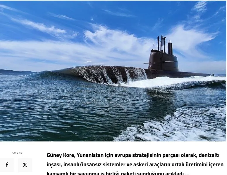 Η Νότια Κορέα ανακοίνωσε ότι έχει προσφέρει στην Ελλάδα ένα ολοκληρωμένο πακέτο αμυντικής συνεργασίας στο πλαίσιο της ευρωπαϊκής στρατηγικής της, συμπεριλαμβανομένης της κατασκευής υποβρυχίων, της κοινής παραγωγής επανδρωμένων/μη επανδρωμένων συστημάτων και στρατιωτικών οχημάτων, γράφει τουρκικό δημοσίευμα.