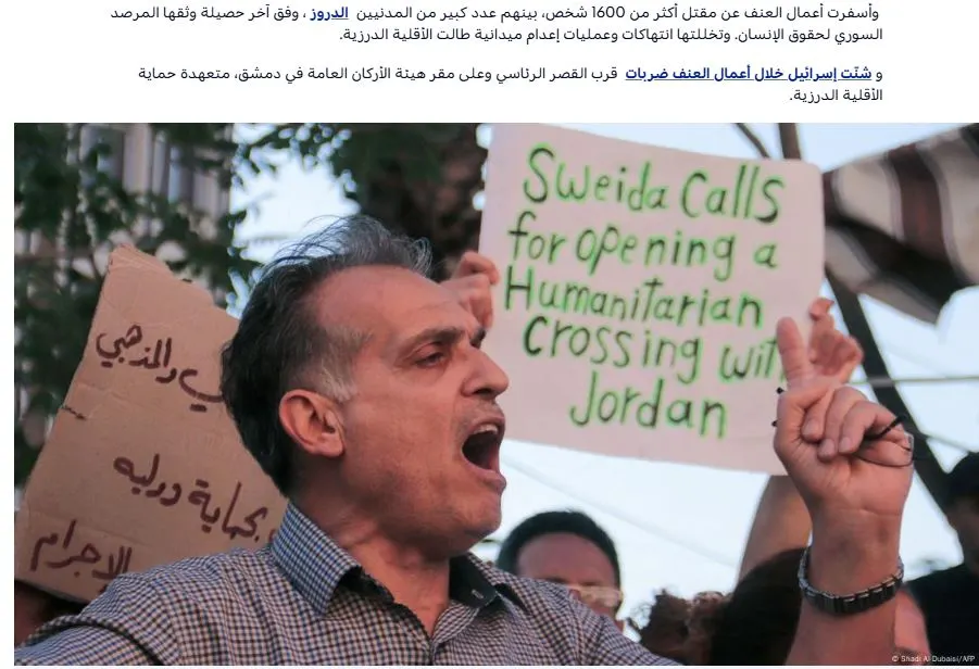 Εκατοντάδες διαδήλωσαν στη συριακή πόλη Σουέιντα με το σύνθημα «Το Δικαίωμα στην Αυτοδιάθεση» και καταδικάζοντας την πρόσφατη αιματηρή βία στην επαρχία, η οποία άφησε πίσω της περισσότερους από 1.600 νεκρούς. Οι διαδηλωτές ύψωσαν σημαίες των Δρούζων και ορισμένες ισραηλινές σημαίες.