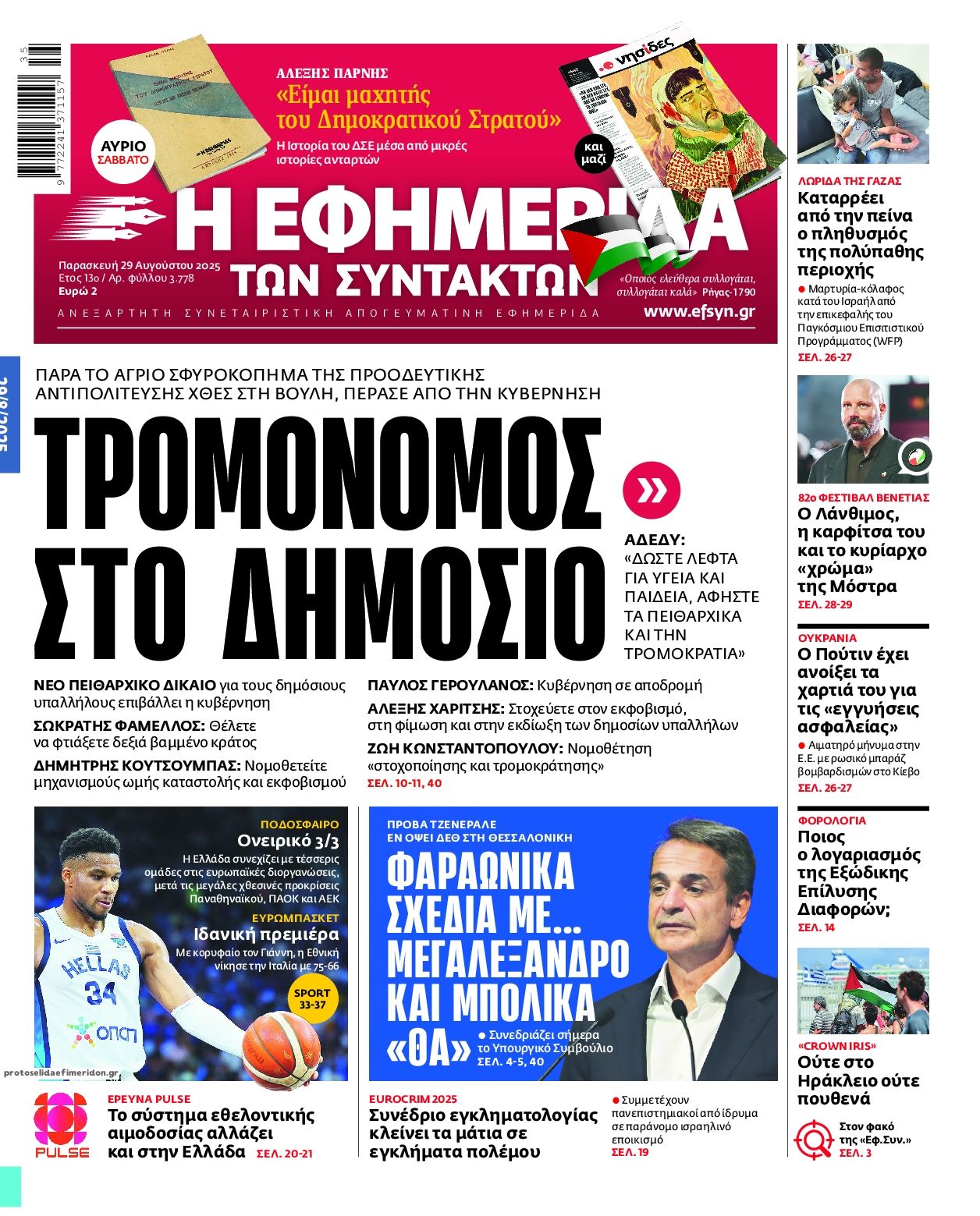 Δείτε εδώ τα πρωτοσέλιδα των εφημερίδων σήμερα Παρασκευή 29 Αυγούστου 2025. Συνεχίστε την ανάγνωση.