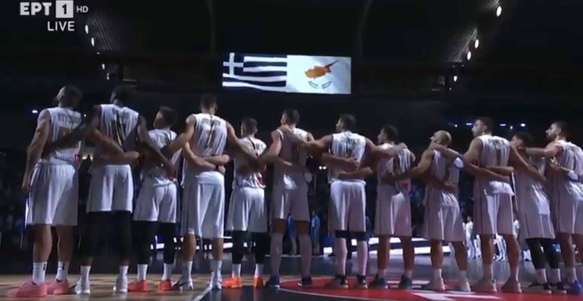 Συγκλονιστικές στιγμές στο κλειστό «Σπύρος Κυπριανού» στη Λεμεσό. Στον αγώνα της Κύπρου με την Ελλάδα ακούστηκε ένας Εθνικός Ύμνος.