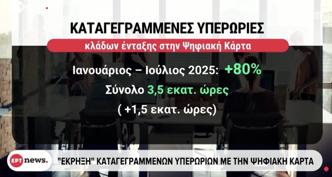 Τεράστια αύξηση καταγράφηκε στις δηλωμένες -και άρα πληρωμένες- υπερωρίες εργαζομένων, σύμφωνα με τα στοιχεία του πληροφοριακού συστήματος «Εργάνη» του υπουργείου Εργασίας και Κοινωνικής Ασφάλισης. Ο λόγος είναι η υποχρεωτική εφαρμογή της ψηφιακής κάρτας εργασίας -έστω και με αστερίσκους- σε μια σειρά από κλάδους με σημαντική οικονομική δραστηριότητα. Συγκεκριμένα, από τον Ιανουάριο έως τον Ιούλιο του 2025 οι καταγεγραμμένες υπερωρίες στους κλάδους ένταξης της ψηφιακής κάρτας εργασίας εμφανίζονται κατά 80% αυξημένες σε σχέση με το ανάλογο επτάμηνο του 2024. Ειδικότερα, έχουν ήδη καταγραφεί περισσότερες από 3,5 εκατ. υπερωρίες εντός του 2025, αριθμός αυξημένος κατά 1,5 εκατ. ώρες συγκριτικά με το αντίστοιχο 7μηνο του 2024.
