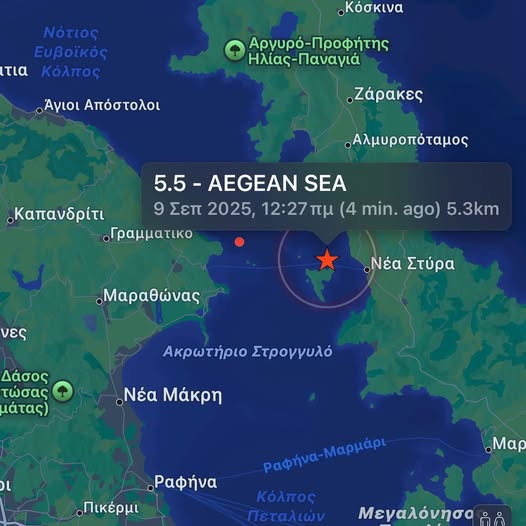 Ισχυρός σεισμός μεγέθους 5.5 Ρίχτερ σημειώθηκε στις 8 Σεπτεμβρίου 2025, στις 21:27 UTC, με επίκεντρο κοντά στα Νέα Στύρα Ευβοίας. Ο σεισμός είχε εστιακό βάθος μόλις 2 χιλιόμετρα και έγινε ιδιαίτερα αισθητός στην Αττική, καθώς το επίκεντρο βρισκόταν περίπου 47 χιλιόμετρα βορειοανατολικά της Αθήνας . Η δόνηση προκάλεσε ανησυχία στους κατοίκους, αλλά μέχρι στιγμής δεν έχουν αναφερθεί σοβαρές ζημιές ή τραυματισμοί. Οι σεισμολόγοι παρακολουθούν την εξέλιξη του φαινομένου, ενώ οι αρχές συνιστούν ψυχραιμία και επαγρύπνηση. Το γεγονός υπενθυμίζει την ανάγκη για συνεχή ετοιμότητα σε σεισμογενείς περιοχές όπως η Ελλάδα.