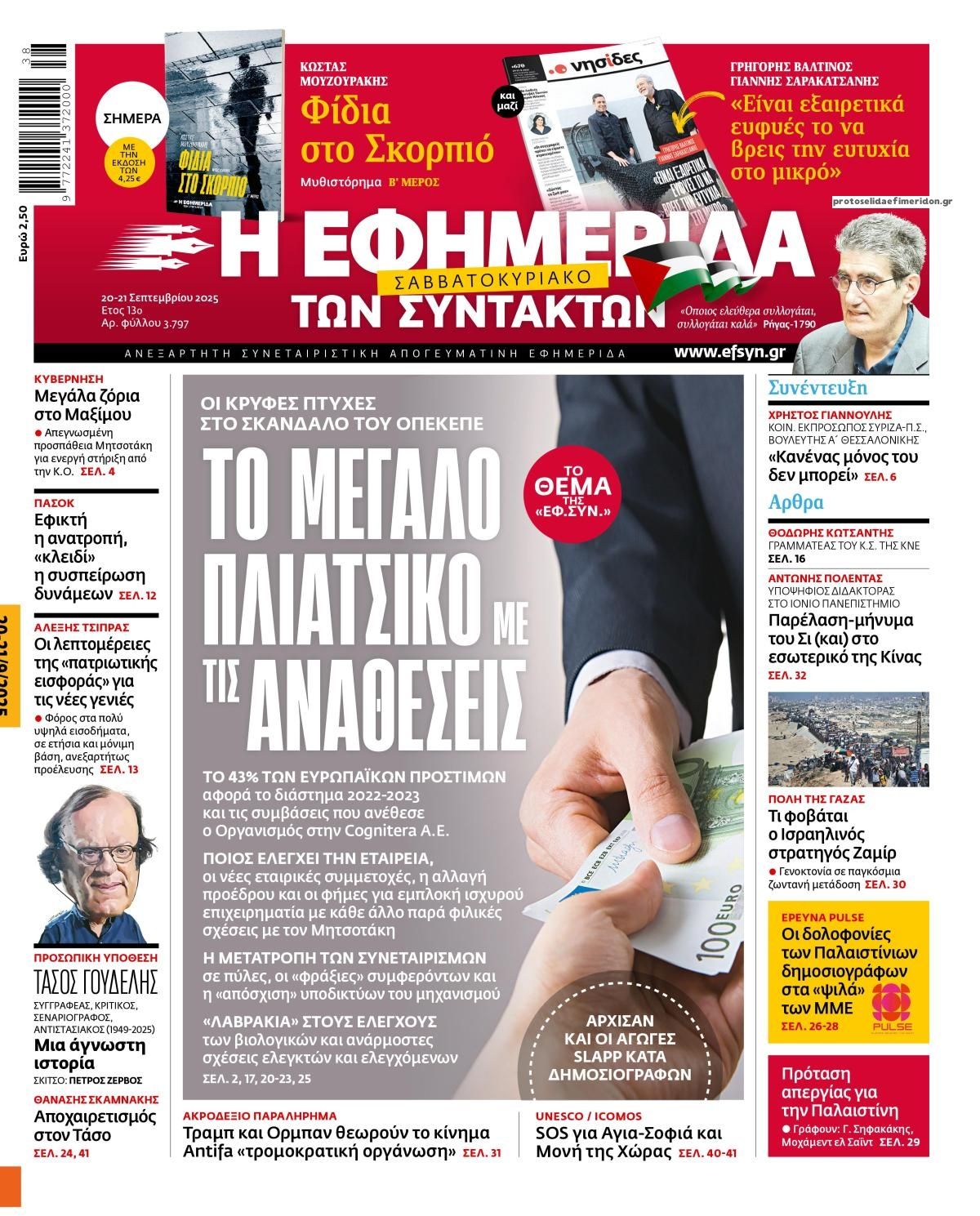 Δείτε εδώ τα πρωτοσέλιδα των εφημερίδων σήμερα Σάββατο 20 Σεπτεμβρίου 2025. Συνεχίστε την ανάγνωση.