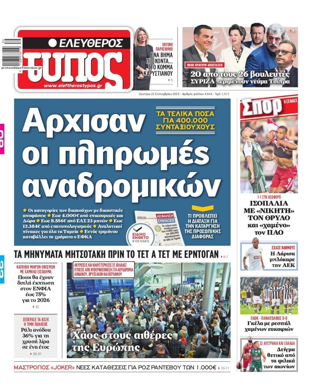 MEDIAΤα πρωτοσέλιδα των εφημερίδων σήμερα Δευτέρα22/09/2025 - 7:00πμΔΙΑΒΑΣΤΕ ΕΠΙΣΗΣ Στην Εστία της Κυριακής: Η συνταγματική αναθεώρηση επισπεύδει τίς εκλογέςΣτην Κυριακάτικη Δημοκρατία: Μοιράζουν χρήμα όσο μας αποκομίζουνΣτο Κυριακάτικο Documento του Κώστα Βαξεβάνη: Πάρτυ εκατομμυρίων στο Μαξίμου και στα υπουργεία με τους συμβούλουςΤην Κυριακή 30/11 με την Εστία της Κυριακής: Το ημερολόγιο του Στρατηγού ΣκόμπιΤην Κυριακή 30/11 με την κυριακάτικη «δημοκρατία»: Σύνταγμα Χωροφυλακής ΑθηνώνΤο πρωτοσέλιδο της εφημερίδας Θεσσαλονίκη που κυκλοφορεί σήμερα ΣάββατοΜε σημαντικές προσφορές κυκλοφορεί η εφημερίδα Θεσσαλονίκη σήμερα ΣάββατοΤα πρωτοσέλιδα των εφημερίδων σήμερα Σάββατο Δείτε εδώ τα πρωτοσέλιδα των εφημερίδων σήμερα Δευτέρα 22 Σεπτεμβρίου 2025. Συνεχίστε την ανάγνωση.ΠΡΩΤΟΣΕΛΙΔΑ ΑΦΗΣΤΕ ΜΙΑ ΑΠΑΝΤΗΣΗ Ακύρωση απάντησης Σχόλιο:εισάγετε το σχόλιό σας! Όνομα:*παρακαλώ εισάγετε το όνομά σας εδώ Email:*έχετε εισάγει εσφαλμένη διεύθυνση ηλεκτρονικού ταχυδρομείου!παρακαλώ εισάγετε εδώ την ηλεκτρονική σας διεύθυνση αποθηκεύστε το όνομα, το ηλεκτρονικό ταχυδρομείο και τον ιστότοπό μου σε αυτό το πρόγραμμα περιήγησης για την επόμενη φορά που θα σχολιάσω. ΔΗΜΟΦΙΛΗ Το τελευταίο αντίο στον 19χρονο Ραφαηλ: Το φέρετρο έφτασε στην εκκλησία τυλιγμένο στη γαλανόλευκη στους ώμους στρατιωτικών που δεν μπορούσαν να συγκρατήσουν τα δάκρυά...Ανατροπή στη δίκη της ΚιβωτούΕπιβίωσε από την τρομοκρατική επίθεση της 11ης Σεπτεμβρίου, για να τον σκοτώσουν στο ξύλο τρία καθάρματα…Bροχή σκανδάλων και εισαγγελέας στο Ίδρυμα Νεολαίας και Δια Βίου ΜάθησηςΕκτακτο διάγγελμα ΖελενσκιΙστορική η «κατρακύλα» Μητσοτακη χωρίς σημεία ανάκαμψηςΑύριο η κηδεία του 19χρονου Ραφαηλ: “Ένα κοπέλι έσβησε πο μια χειροβομβίδα” γράφει συντετριμμένος ο πατέρας τουΑνάρτηση βόμβα του Πάνου Καμμενου: Ακριβώς έτσι οι Γερμανοί σχεδιάζουν να μπλέξουν την Ευρώπη στον 3ο παγκόσμιο πόλεμο για να σωθούν…..