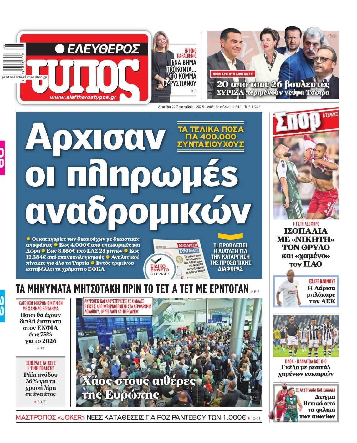 Δείτε εδώ τα πρωτοσέλιδα των εφημερίδων σήμερα Δευτέρα 22 Σεπτεμβρίου 2025. Συνεχίστε την ανάγνωση.