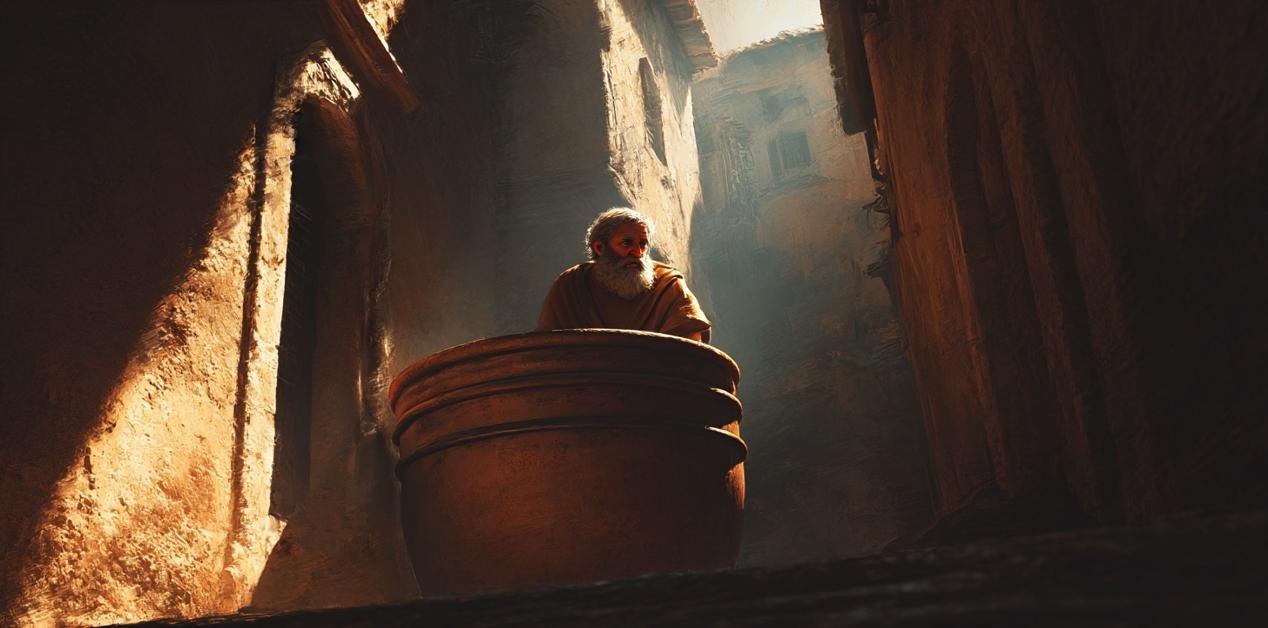 Στον 4ο αιώνα π.Χ., ο Διογένης, γιος τραπεζίτη από τη Σινώπη, βρέθηκε στο κέντρο ενός σκανδάλου για παραχάραξη νομισμάτων. Η τιμωρία ήταν σκληρή: έχασε την ιδιότητα του πολίτη, την περιουσία και όλα του τα υπάρχοντα. Αντί να καταρρεύσει, ο Διογένης μετέτρεψε αυτή την απώλεια σε φιλοσοφικό πείραμα ζωής.