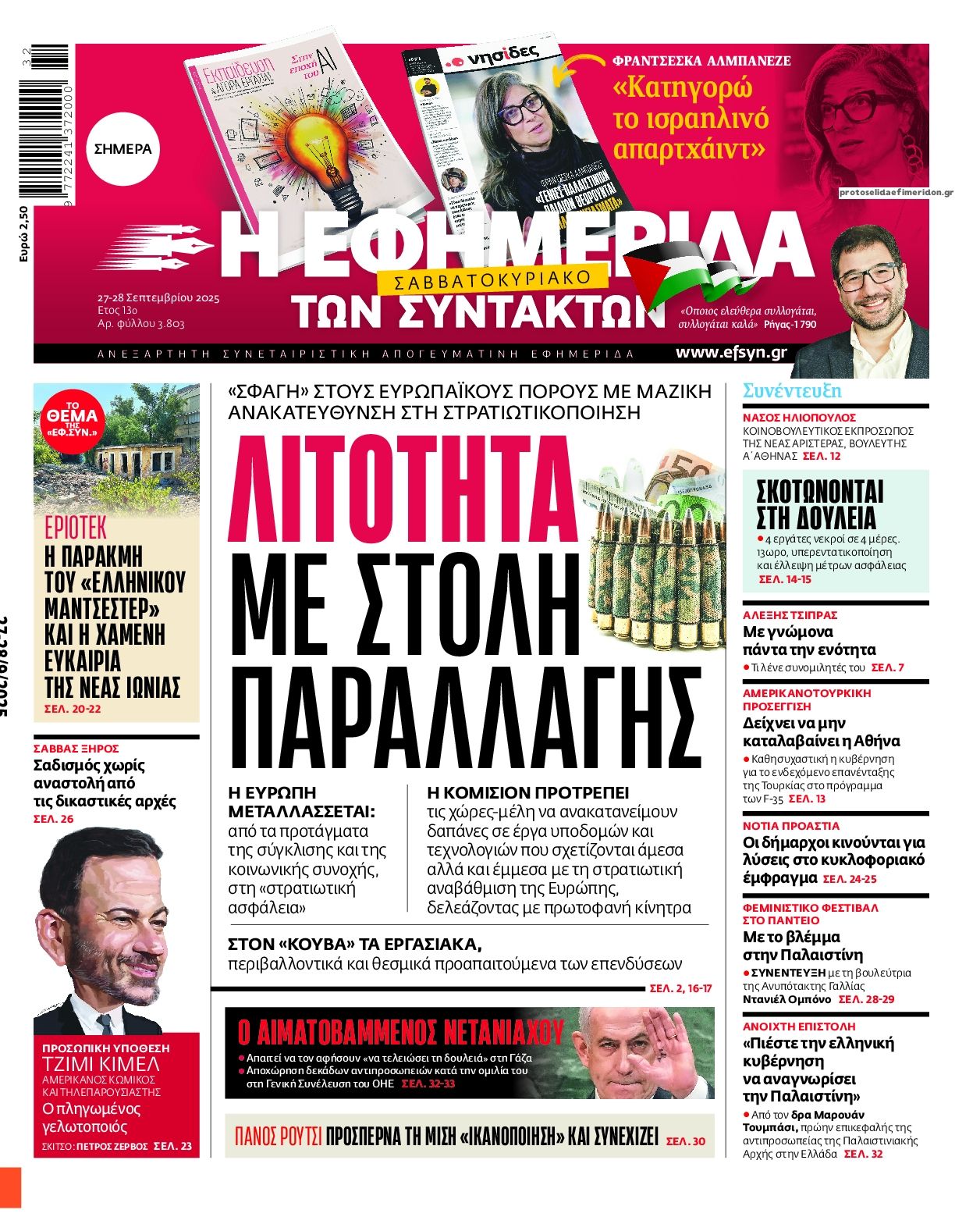 Δείτε εδώ τα πρωτοσέλιδα των εφημερίδων σήμερα Σαββατο 27 Σεπτεμβρίου 2025. Συνεχίστε την ανάγνωση.