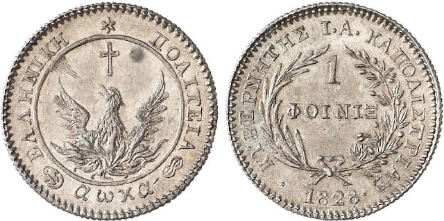 Ιερό μυθικό πουλί. Η Φιλική Εταιρεία χρησιμοποίησε τον Φοίνικα ως σύμβολο του Ελληνικού κράτους που ξαναγεννιέται από τη στάχτη του. Ο Α. Υψηλάντης στη σημαία του Ιερού Λόγου και ο Καποδίστριας τον καθιέρωσε επίσημο έμβλημα του κράτους και το απεικόνισε πάνω στα νομίσματα και τις σφραγίδες. Από τον Ησίοδο τον -8ο αιώνα, έχουμε την αρχαιότερη αναφορά για τον Φοίνικα, που τον ταυτίζει με τον ήλιο και τον Θεό Απόλλωνα.