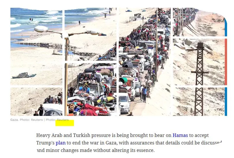 Ασκούνται έντονες αραβικές και τουρκικές πιέσεις στη Χαμάς να αποδεχτεί το σχέδιο Τραμπ για τον τερματισμό του πολέμου στη Γάζα, με διαβεβαιώσεις ότι οι λεπτομέρειες θα μπορούσαν να συζητηθούν και να γίνουν μικρές αλλαγές χωρίς να αλλοιωθεί η ουσία του.