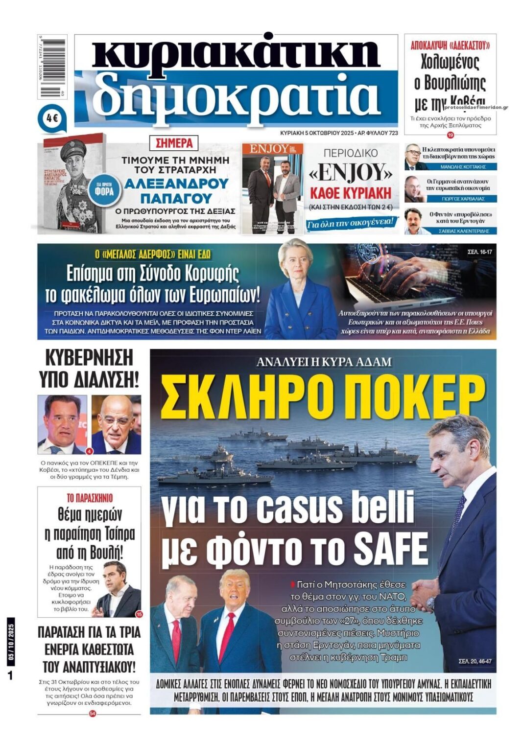 Δείτε εδώ τα πρωτοσέλιδα των εφημερίδων σήμερα Κυριακή 05 Οκτωβρίου 2025. Συνεχίστε την ανάγνωση.